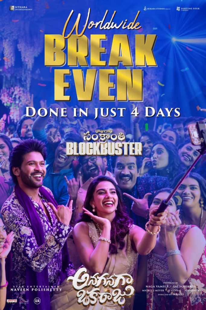 టాలీవుడ్ యువ కథానాయకుడు నవీన్ పొలిశెట్టి, టాలెంటెడ్ హీరోయిన్ మీనాక్షి చౌదరి జంజోడీగా నటించిన తాజా చిత్రం ‘అనగనగా ఒక రాజు’. ఫ్యామిలీ ఎంటర్టైన్గా తెరకెక్కిన ఈ చిత్రాన్ని సితార ఎంటర్టైన్మెంట్స్, ఫార్చూన్ ఫోర్ సినిమాస్ నిర్మాణ సంస్థలు సంయుక్తంగా నిర్మించాయి. నూతన దర్శకుడు మారి తెరకెక్కించిన ఈ చిత్రం ఈ నెల 14న భారీ ఎత్తున విడుదలై బ్లాక్ బాస్టర్ టాక్ తో దూసుకుపోతోంది. తనదైన కామెడీ టైమింగ్, పంచులతో నవీన్ పొలిశెట్టి బాక్సాఫీస్ వద్ద రికార్డులు సృష్టిస్తున్నారు. ముఖ్యంగా ఫ్యామిలీ ఆడియన్స్ పెద్ద ఎత్తున థియేటర్లకు తరలిరావడంతో అన్ని చోట్లా షోలు హౌస్ఫుల్ అవుతున్నాయి. వీకెండ్ కావడంతో కలెక్షన్లు మరింత పెరుగుతున్నాయి.
