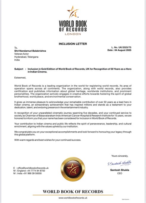 50 ఏళ్ళు సినిమా రంగంలో హీరో గా రాణిస్తోన్న నందమూరి బాలకృష్ణ ను (Bala Krishna), వరల్డ్ బుక్ అఫ్ రికార్డ్స్ (World Book of Records), గోల్డ్ ఎడిషన్ లో చేర్చింది.