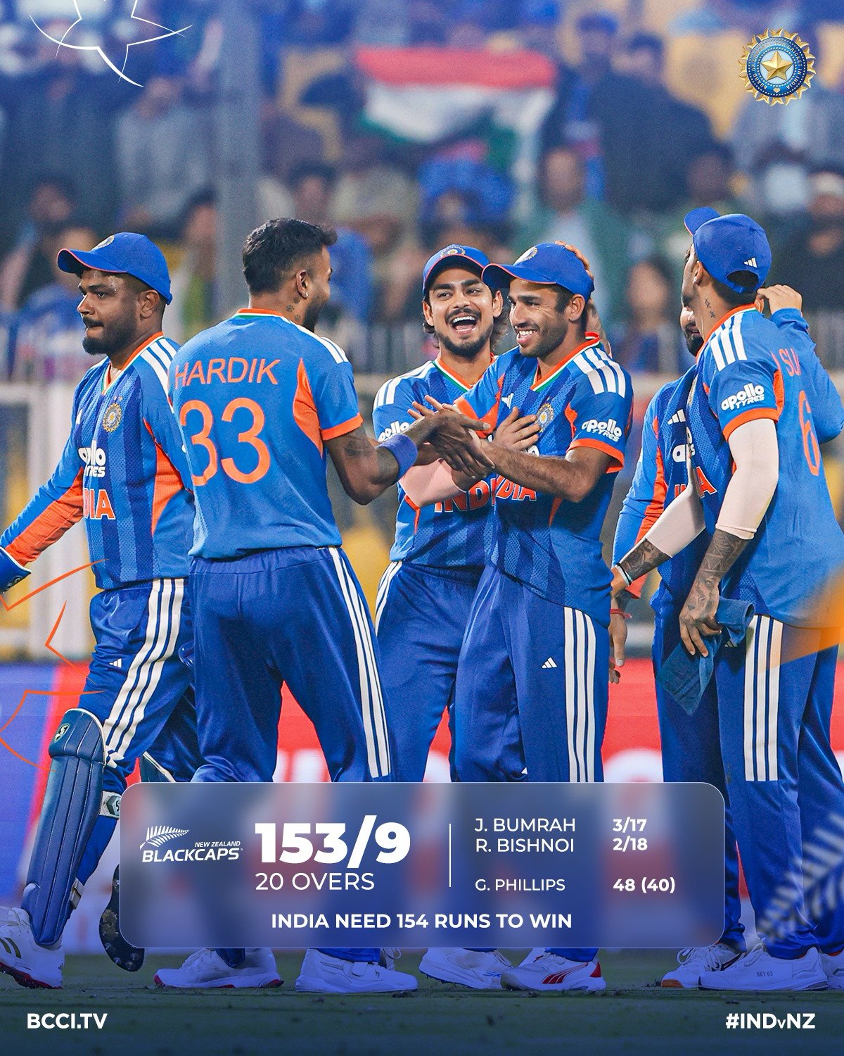 భారత జట్టు బౌలర్లలో బుమ్రా మూడు వికెట్లు, హార్దిక్ పాండ్య, బిష్ణోయ్ లు రెండేసి వికెట్లు తీసుకున్నారు. హర్షిత్ రానా కు  ఒక వికెట్ దక్కింది.