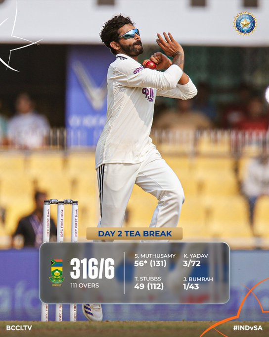 భారత, సౌత్ ఆఫ్రికా జట్ల మధ్య గౌహతి లో జరుగుతోన్న రెండవ టెస్ట్ లో సౌత్ ఆఫ్రికా పట్టుదలతో ఆడుతోంది. టీ విరామ సమయానికి, మొదటి ఇన్నింగ్స్ లో 6 వికెట్ల నష్టానికి 316 పరుగులు చేసింది. సౌత్ ఆఫ్రికా ఇన్నింగ్స్ లో ముత్తుసామి అర్ధ సెంచరీ చేయడం విశేషం.