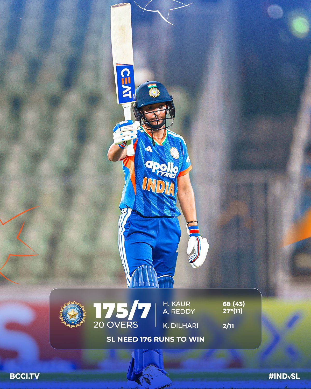 భారత, శ్రీలంక మహిళల జట్ల మధ్య జరుగుతోన్న ఐదవ టి 20 మ్యాచ్ లో టాస్ ఓడిపోయి మొదట బ్యాటింగ్ చేసిన భారత మహిళల జట్టు నిర్ణీత 20 ఓవర్ల లో ఏడు వికెట్ల నష్టానికి 175 పరుగులు చేసింది.