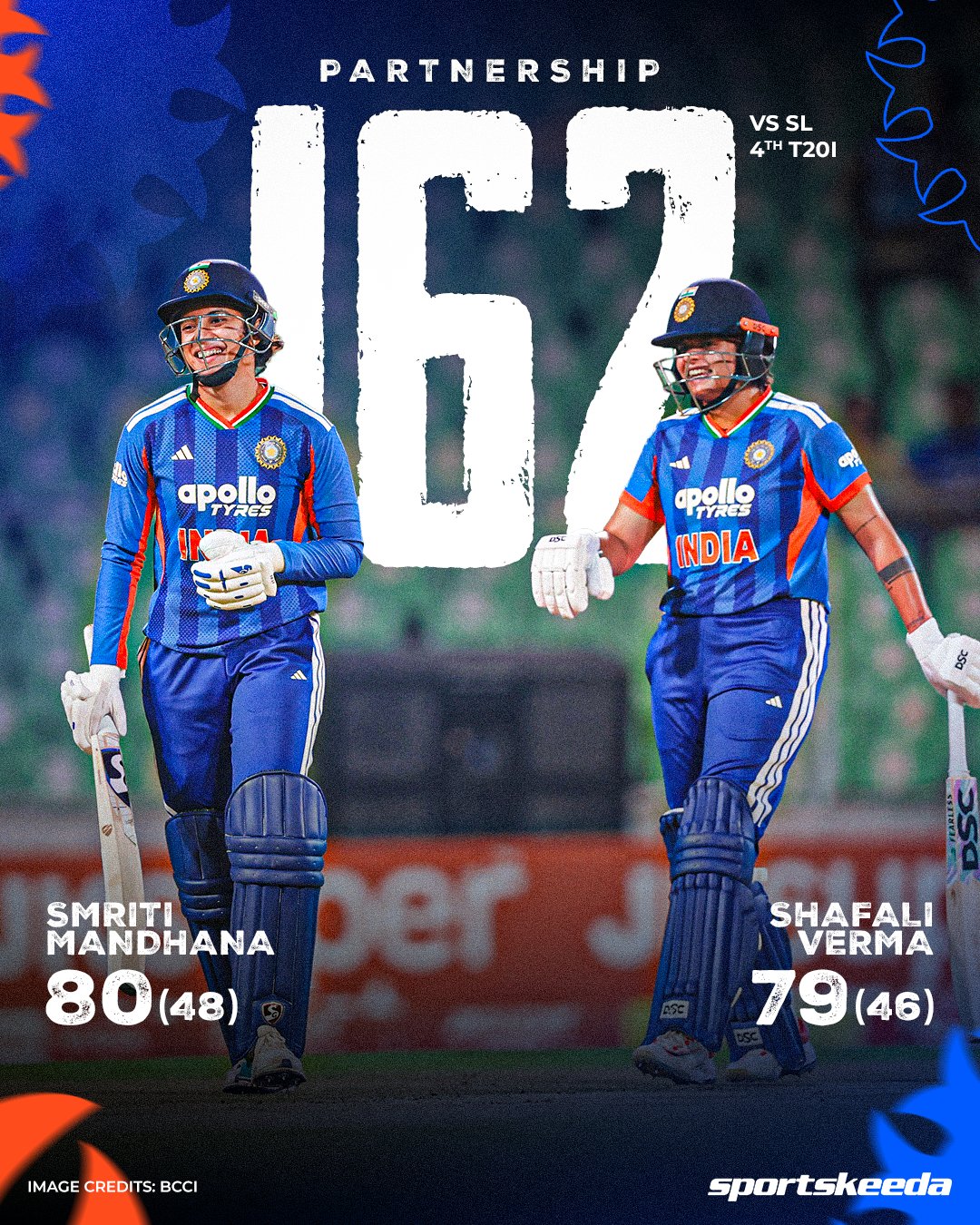 భారత మహిళల జట్టు ఓపెనర్లు షెఫాలీ వర్మ, స్మ్రితి మందన మొదటి వికెట్ కు ధాటిగా ఆడుతూ 162 పరుగులు జోడించారు. 46 బంతుల్లో 79 పరుగులు చేసిన షెఫాలీ వర్మ, 48 బంతుల్లో 80 పరుగులు చేసిన స్మ్రితి మందన ఇద్దరు వెంట వెంటనే అవుట్ అయ్యారు.