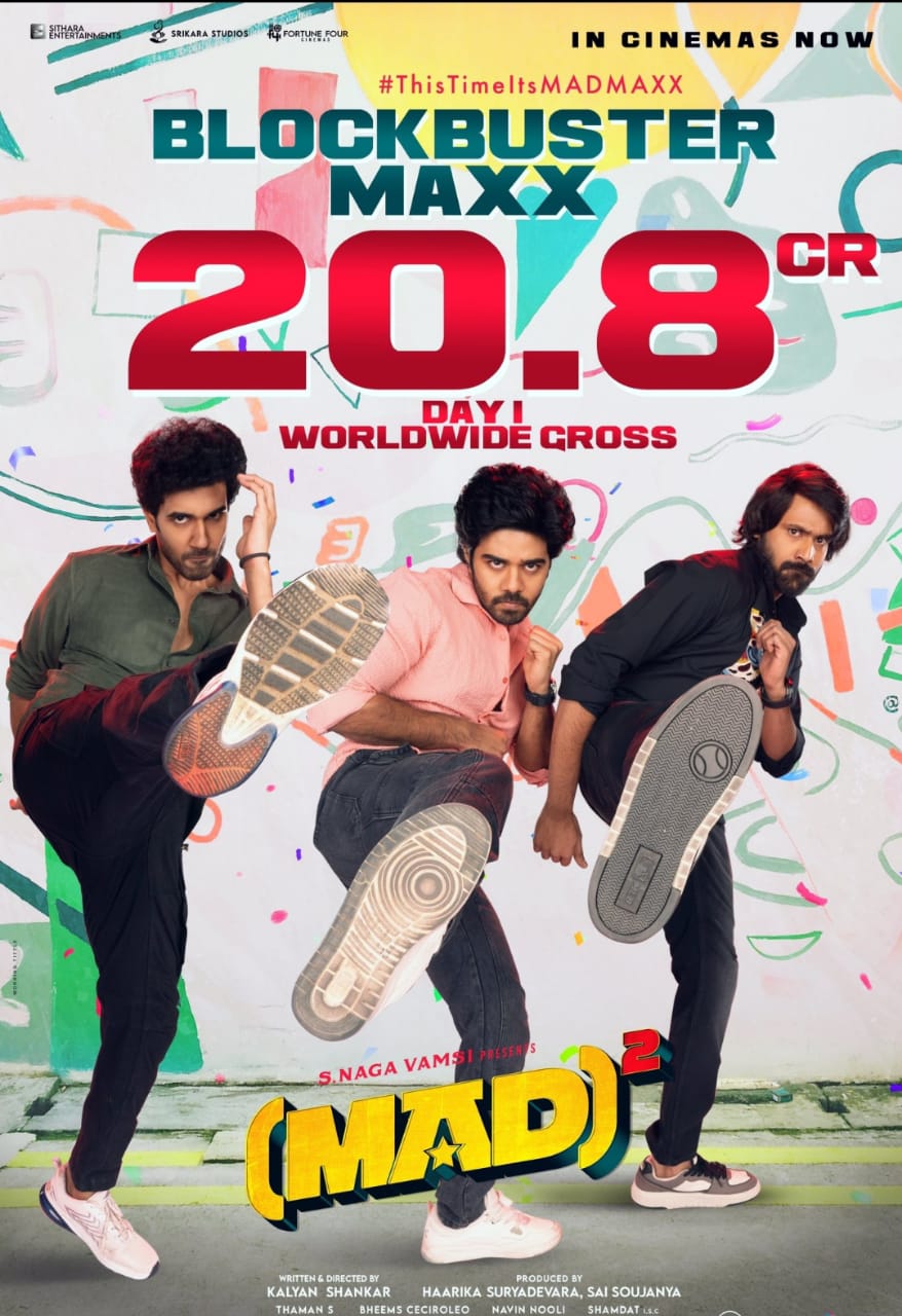 టాలీవుడ్ అగ్ర నిర్మాణ సంస్థ సితార ఎంటర్‌టైన్‌మెంట్స్ నుంచి వచ్చిన మ‌రో క్రేజీ ప్రాజెక్ట్ ‘మ్యాడ్ స్క్వేర్’. సూప‌ర్ హిట్ సినిమా మ్యాడ్ సినిమాకు సీక్వెల్‌గా ఈ మూవీ తెరకెక్కింది. నార్నె నితిన్‌, సంగీత్‌ శోభన్‌, రామ్‌ నితిన్‌, విష్ణు ప్రధాన పాత్రల్లో నటించిన ఈ చిత్రానికి కల్యాణ్‌శంకర్‌ దర్శకుడు. హారిక సూర్యదేవర, సాయిసౌజన్య నిర్మించారు. భారీ అంచనాల మధ్య మార్చి 28న విడుదలైన ఈ సినిమా సూపర్ హిట్ టాక్ తో దూసుకెళ్తోంది. ఈ నేపథ్యంలోనే బాక్సాఫీస్‌ వద్ద మొదటిరోజే భారీ కలెక్షన్స్‌తో రికార్డ్‌ క్రియేట్‌ చేసింది. మ్యాడ్ స్క్వేర్ (Mad Square) చిత్రాన్ని ప్రపంచవ్యాప్తంగా 650కి పైగా థియేటర్లలో విడుదల చేశారు. అయితే, ఈ సినిమా మొదటిరోజే బాక్సాఫీస్‌ వద్ద రూ. 20.8 కోట్ల గ్రాస్‌ వసూళ్లు సాధించి సెన్సేషనల్ రికార్డ్‌ సాధించింది. తాజాగా ఈ విషయాన్ని మేకర్స్ అధికారికంగా ప్రకటించారు. ఈ మేరకు క్రేజీ పోస్టర్ ను కూడా రిలీజ్ చేశారు.
