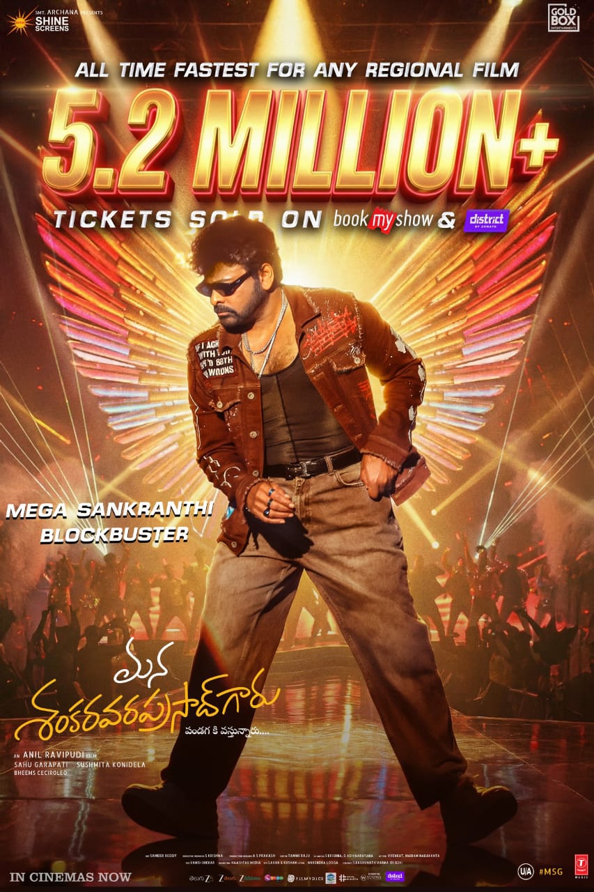 ఇండియాలోనే కాకుండా ఓవర్సీస్లోనూ ‘మన శంకర వరప్రసాద్ గారు’ (Mana Shankara Vara Prasad Garu) రికార్డు క్రియేట్ చేస్తోంది. తాజా సమాచారం ప్రకారం, ఈ సినిమా $5 మిలియన్ల మైలురాయిని అధిగమించింది. దీంతో చిరంజీవి కెరీర్లోనే ఓవర్సీస్ లో అత్యధిక వసూళ్లు రాబట్టిన చిత్రంగా ఇది నిలిచింది. అలాగే పాపులర్ ఆన్లైన్ టికెట్ బుకింగ్ ప్లాట్ఫామ్స్ బుక్ మై షో (Book My Show) , డిస్ట్రిక్ట్ యాప్స్ లో మన శంకర వరప్రసాద్ గారు ట్రెండ్ కొనసాగుతోంది. ఈ సినిమాకు సంబంధించి ఏకంగా 5.2 మిలియన్ కు పైగా టికెట్స్ అమ్ముడవ్వడం విశేషం. ఇది రీజనల్ గా ఆల్ టైమ్ రికార్డు కూడా అని మేకర్స్ అధికారికంగా ప్రకటించారు. ప్రస్తుతం ఉన్న ట్రెండ్ చూస్తుంటే, ఈ సినిమా థియేట్రికల్ రన్ ముగిసేలోగా మరిన్ని రికార్డులు సాధించే అవకాశం స్పష్టంగా కనిపిస్తోంది.