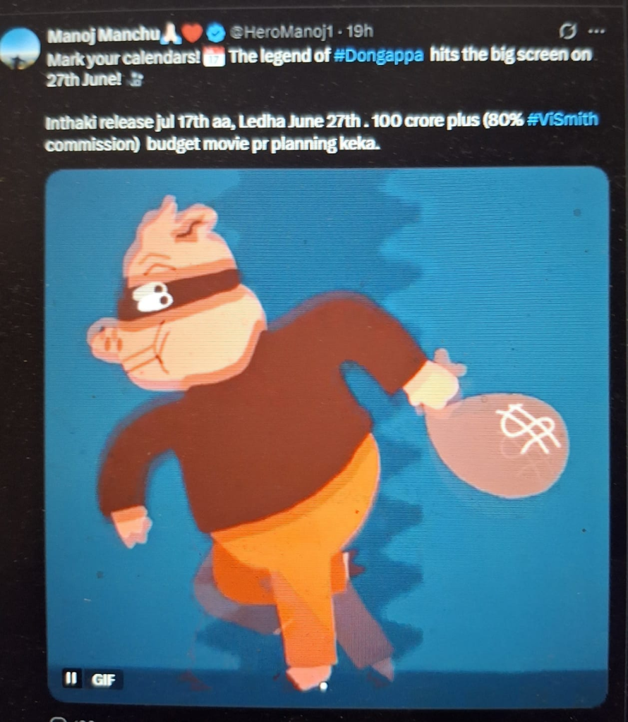 తాజాగా మంచు విష్ణు పై, మంచు మనోజ్ ఎక్స్ లో ఒక వివాదాస్పద పోస్ట్ పెట్టాడు. ఈ పోస్ట్ లో ది లెజెండ్ అఫ్ దొంగప్ప జూన్ 27 వస్తున్నాడు అని పెట్టాడు. అంతే కాకుండా 80% కమిషన్ తో 100 కోట్ల బడ్జెట్ సినిమా తీశారు. మీ పి ఆర్ టీం కేక అని రాసుకొచ్చారు