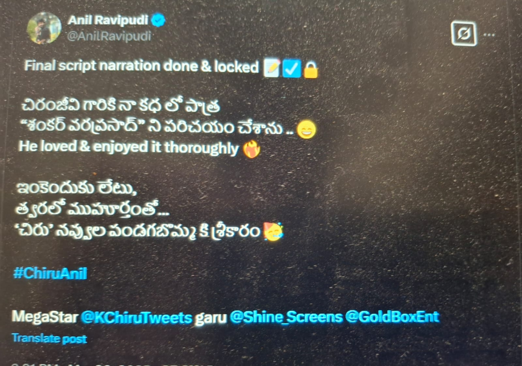 ‘ఈ సినిమా ఫైనల్ స్క్రిప్ట్ మొత్తం పూర్తయింది. మెగాస్టార్ చిరంజీవి (Chiranjeevi) గారికి కథ మొత్తం చదివి వినిపించాను. నా స్టోరీలోని శంకర్ వరప్రసాద్ పాత్ర గురించి చిరుకు చెప్పాను. కథ ఆయనకు బాగా నచ్చింది. వెంటనే గ్రీన్ సిగ్నల్ ఇచ్చారు. ఇక ఆలస్యం ఎందుకు త్వరలోనే ముహూర్తంతో చిరునవ్వుల పండగబొమ్మకు శ్రీకారం చుట్టేద్దాం’ అని ట్విటర్లో అనిల్ రావిపూడి ట్వీట్ చేశాడు. కాగా, చిరంజీవి అసలు పేరు శివ శంకర్ వర ప్రసాద్ అనే సంగతి తెలిసిందే. ఇక తాజా సమాచారం ప్రకారం ఈ ఉగాది పండుగ రోజు ఈ చిత్రాన్ని లాంఛనంగా ప్రారంభించబోతున్నారని తెలిసింది. కామెడీ యాక్షన్ ఎంటర్టైనర్గా తెరకెక్కనున్న ఈ చిత్రాన్ని షైన్ స్క్రీన్స్, గోల్డ్ బాక్స్ ఎంటర్టైన్మెంట్ పతాకాలపై నిర్మించనున్నట్లు సమాచారం. ఈ చిత్రానికి భీమ్స్ సిసిరోలియో సంగీతం అందించనున్నాడు.