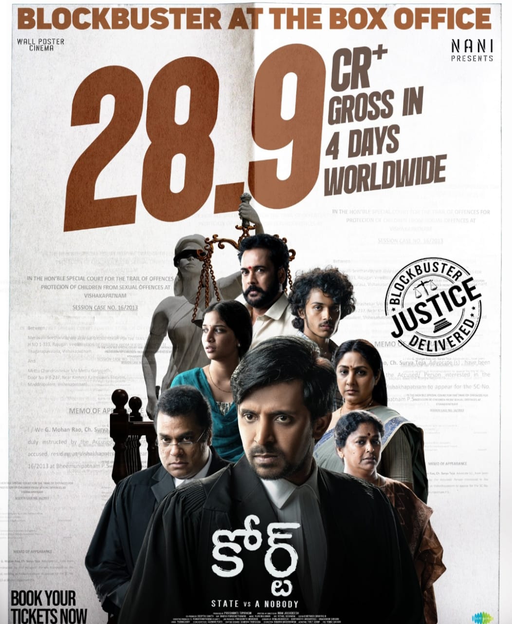 నేచురల్ స్టార్ నాని (Natural Star Nani) నిర్మాతగా తెరకెక్కిన తాజా చిత్రం ‘కోర్ట్’. స్టేట్ వ‌ర్సెస్ ఏ నోబ‌డీ అనేది ఉప‌శీర్షిక‌. ఈ సినిమాలో ప్రియ‌ద‌ర్శి ప్ర‌ధాన పాత్ర‌ పోషించారు. హర్ష రోషన్, శ్రీదేవి జంటగా నటించారు. రామ్ జగదీశ్ దర్శకత్వంలో తెరకెక్కిన ఈ సినిమాను ప్ర‌శాంతి త్రిపిరినేని నిర్మించారు. హోలీ పండుగ కానుకగా మార్చి 14న థియేటర్లలో విడుదలైన ఈ మూవీ సూపర్ హిట్ టాక్​ను దూసుకెళ్తోంది. ఈ క్రమంలోనే బాక్సఫీస్ వద్ద కలెక్షన్ల సునామీ సృష్టిస్తోంది. కోర్టు (Court) సినిమా విడుదలైన నాలుగు రోజుల్లోనే ప్రపంచవ్యాప్తంగా రూ. 28.90 కోట్ల కలెక్షన్లు వసూలు చేయడం విశేషం. ఈ విషయాన్ని చిత్ర బృందం అధికారికంగా ప్రకటించారు. ఈ క్రమంలోనే స్పెషల్ పోస్టర్ ను రిలీజ్ చేశారు.