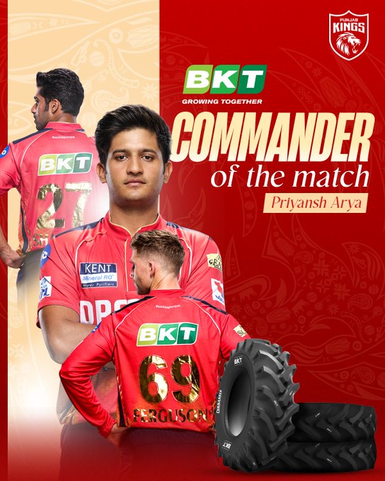 83 పరుగులకే 5 వికెట్లు కోల్పోయిన దశలో, శశాంక్ సింగ్, ప్రియాంశ్ ఆర్య లు ఆరవ వికెట్ కు 71 పరుగులు జోడించాక, ఓపెనర్ ప్రియాంశ్ ఆర్య 42 బంతుల్లో, 9 సిక్సర్లు, 7 ఫోన్ల సాయంతో 103 పరుగులు చేసి అవుట్ అయ్యాడు.