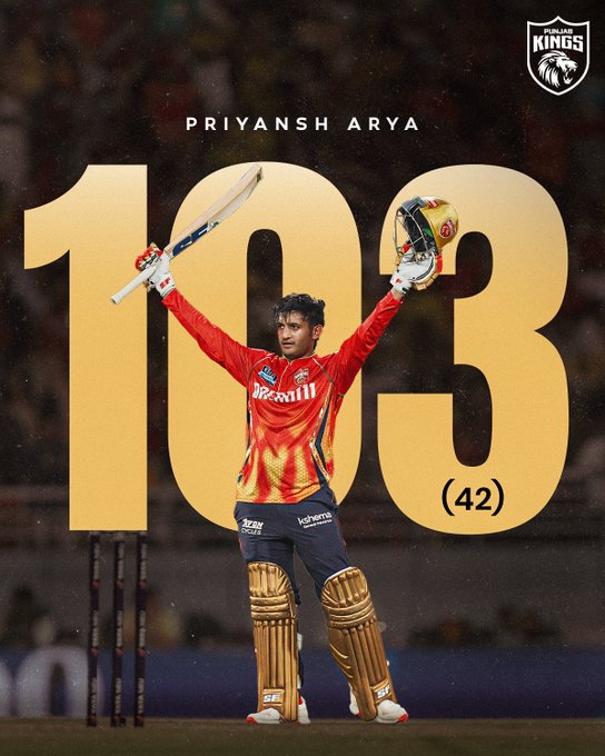 83 పరుగులకే 5 వికెట్లు కోల్పోయిన దశలో, శశాంక్ సింగ్, ప్రియాంశ్ ఆర్య  లు ఆరవ వికెట్ కు 71 పరుగులు జోడించాక, ఓపెనర్  ప్రియాంశ్ ఆర్య 42 బంతుల్లో, 9 సిక్సర్లు, 7 ఫోన్ల సాయంతో 103 పరుగులు చేసి అవుట్ అయ్యాడు.