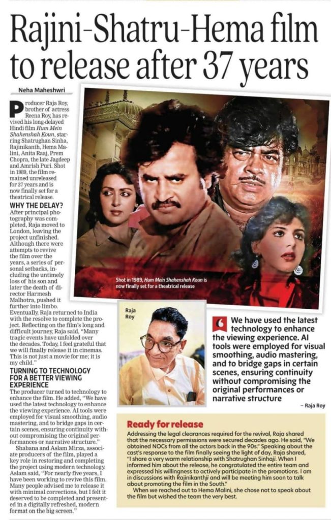 ఇలా ఎన్నో కారణాలతో వాయిదా పడిన ఈ చిత్రం.. ఇప్పుడు ఆధునాతన టెక్నాలజీతో ‘హమ్ మేన్ షాహెన్షా కౌన్ టైటిల్’తోనే ఈ ఏడాది వేసవి కానుకగా ఏప్రిల్ లో విడుదల కానుంది. ఈ మూవీ పిక్చర్ క్వాలిటీతో పాటు సౌండ్ కోసం ఏఐ టెక్నాలజీని ఉపయోగించినట్లు మేకర్స్ వెల్లడించారు. ఏదేమైనా ఇన్నేళ్ల తర్వాత ఈ సినిమా విడుదల కానుండడంతో అభిమానులు ఆసక్తిగా ఉన్నారు. మరి దిగ్గజ నటీనటులు భాగమైన ఈ చిత్రం వెండితెరపై ఎలాంటి మ్యాజిక్ చేస్తుందన్నది చూడాలి. కాగా, ఈ సినిమా హీరో రజనీకాంత్ ప్రస్తుతం ప్రస్తుతం వరుస చిత్రాలతో బిజీగా ఉన్నారు. నెల్సన్ దిలీప్ కుమార్ దర్శకత్వంలో జైలర్ 2 చేస్తుండగా… శిబి చక్రవర్తి దర్శకత్వంలో ‘తలైవా- 173’ మూవీ చేయనున్నారు.