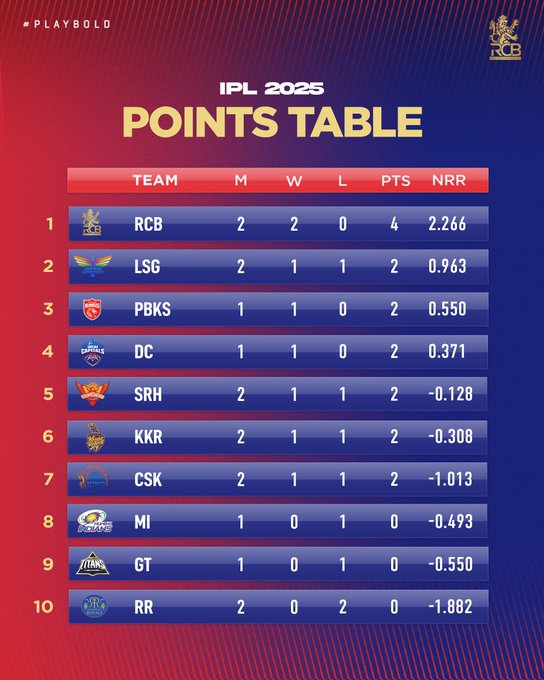 పాయింట్ల పట్టిక అగ్రస్థానంలో రాయల్ చాలెంజర్స్ బెంగుళూరు. ఆడిన రెండు మ్యాచ్ లు గెలిచి 4 పాయింట్లతో అగ్రస్థానంలో ఉంది