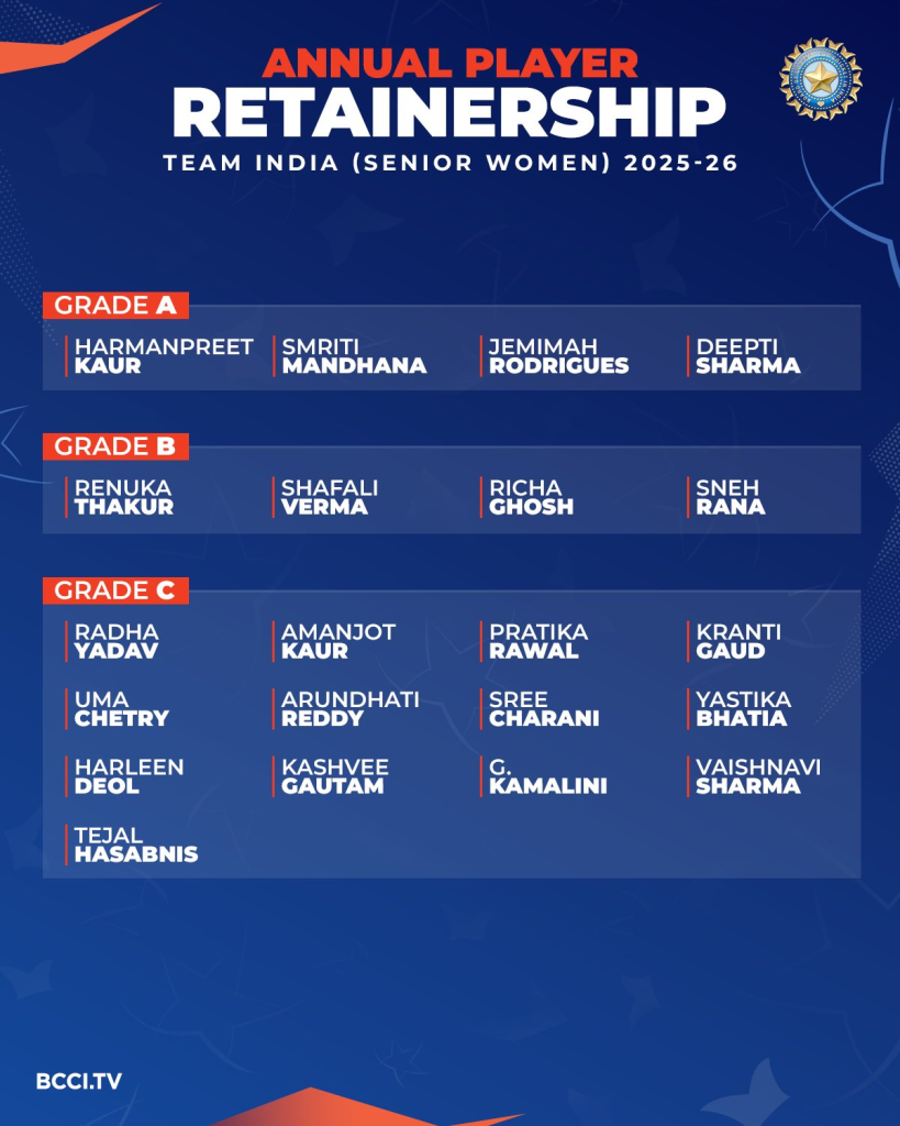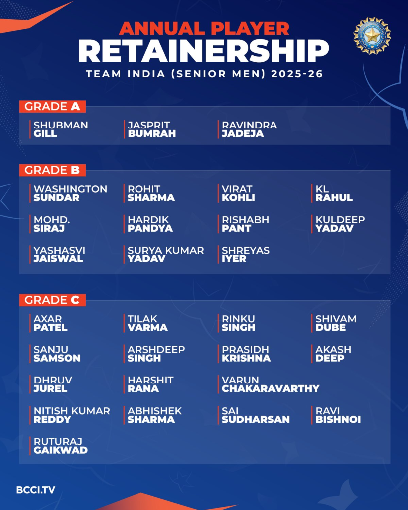 2025-26 సంవత్సరాలకు బీసీసీఐ (BCCI) పురుషుల, మహిళల కాంట్రాక్టులు గ్రేడ్ లను ప్రకటించింది.  సీనియర్ ఆటగాళ్లు రోహిత్ శర్మ (Rohit Sharma) , విరాట్ కోహ్లీ (Virat Kohli) లను గ్రేడ్ బి లో ఉంచింది
