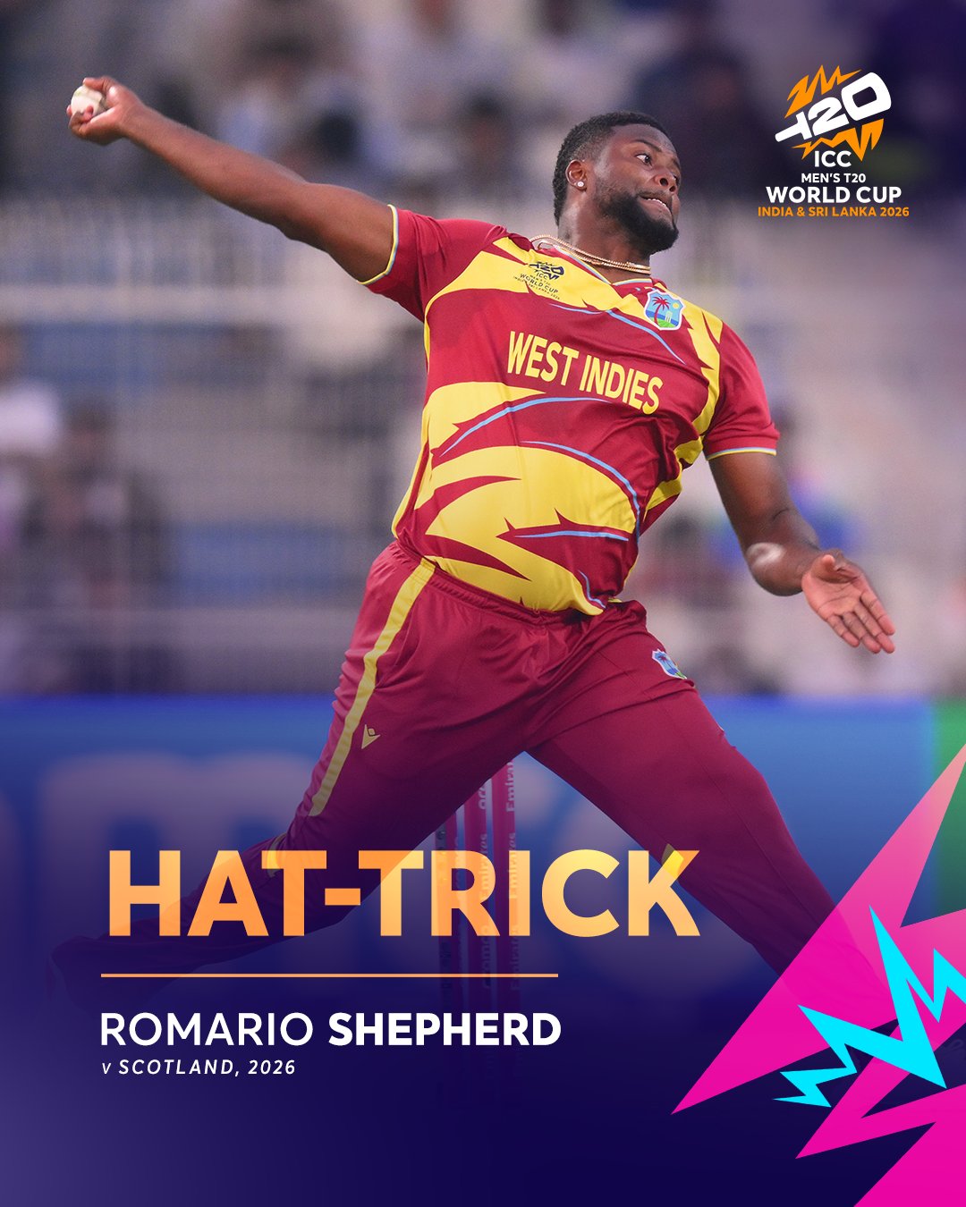 2026 టి 20 వరల్డ్ కప్ లో మొదటి హ్యాట్రిక్ నమోదైంది. వెస్ట్ ఇండీస్ పేసర్ రొమారియో షెఫర్డ్ ఇన్నింగ్స్ 17 వ ఓవర్లో వరుస బంతుల్లో లీస్క్, డేవిడ్సన్ షరీఫ్ వికెట్లను తీసి వరల్డ్ కప్ లో మొదటి హ్యాట్రిక్ నమోదు చేశాడు. ఈ మ్యాచ్ లో రొమారియో షెఫర్డ్ 5 వికెట్లు తీసుకున్నాడు